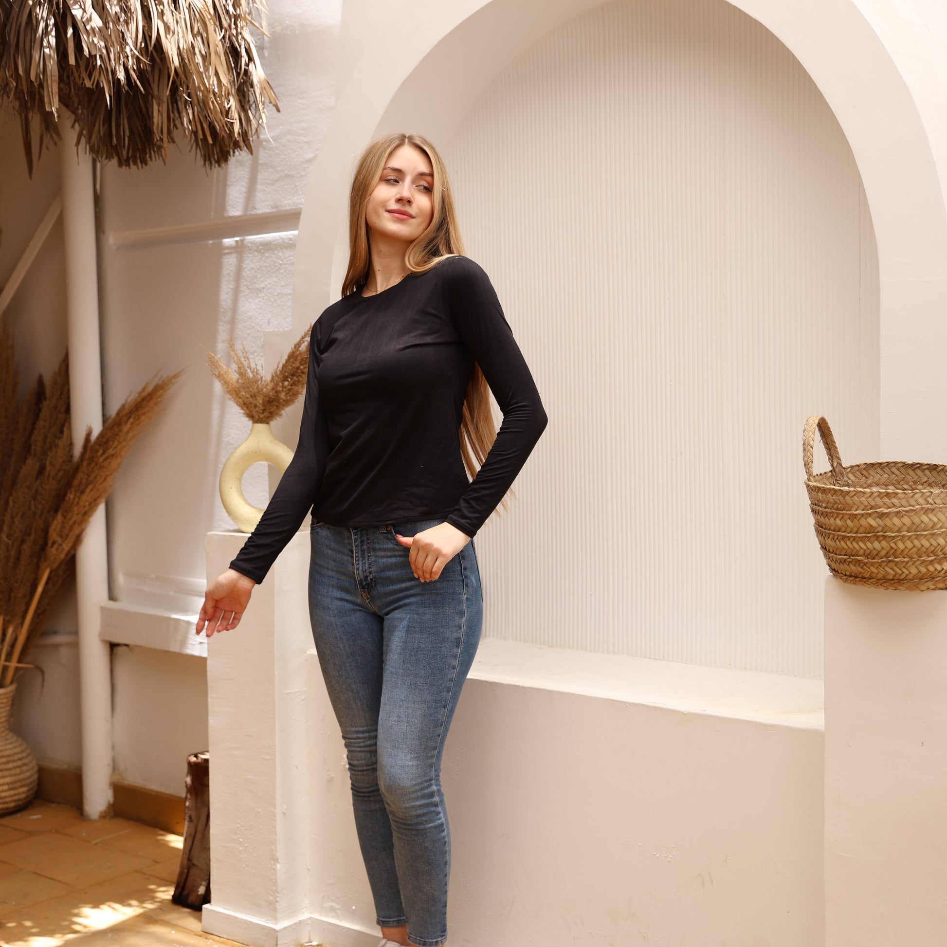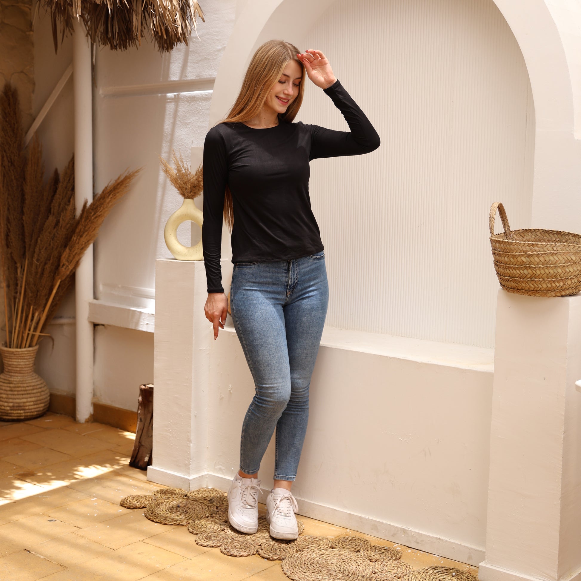 Elevate your everyday look with our must-have La Reine Black Round Neck Long Sleeve Basic Top! Crafted with soft, high-quality fabric, this top offers comfort and style. Its classic round neck and long sleeves make it perfect for any occasion. Upgrade your wardrobe with this versatile essential.