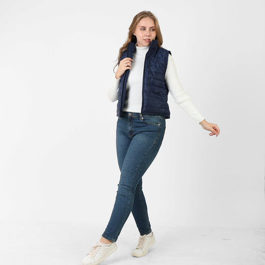 La Reine Blue Black Stand Collar Lightweight Short Down Vest