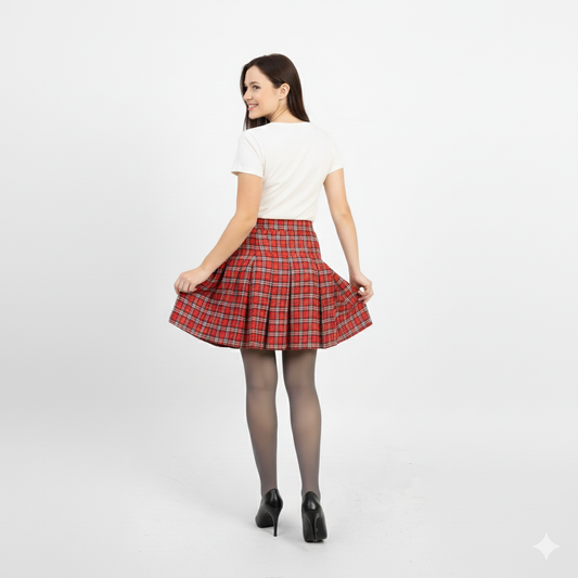 La Reine Red High-Waist Checked Pleated Skater Skirt