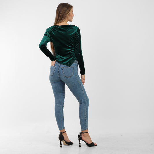 La Reine Olive Asymmetrical Neck Line Long Sleeve Velvet Top