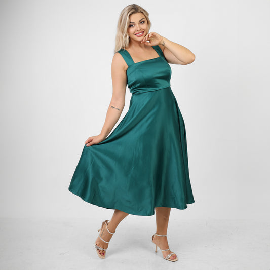 La Reine Green Ruched Satin wide Midi Satin Dress