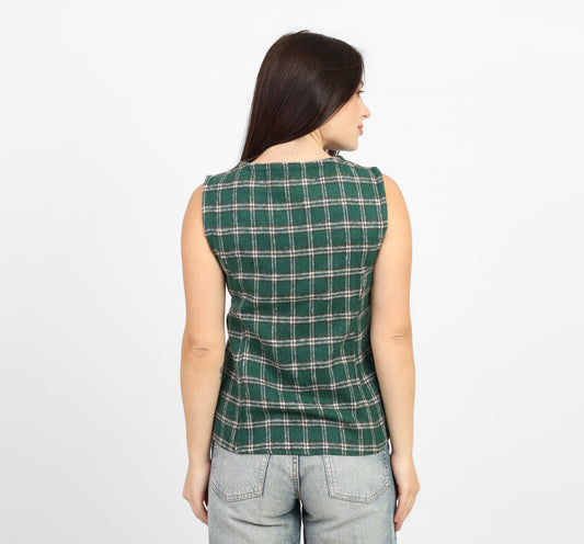 La Reine Green Fitted Sleeveless Plaid Vest Top with Button Front