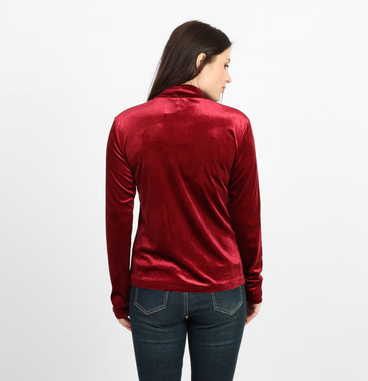 La Reine Burgundy Ribbed Knit Mock Neck Blouse with Side Buckle Detail