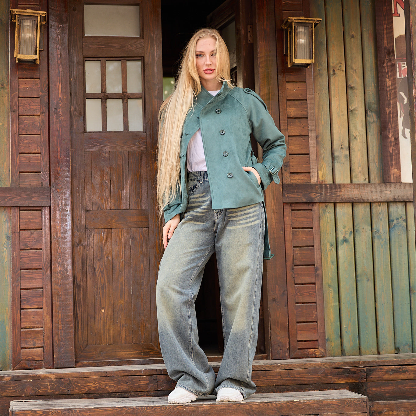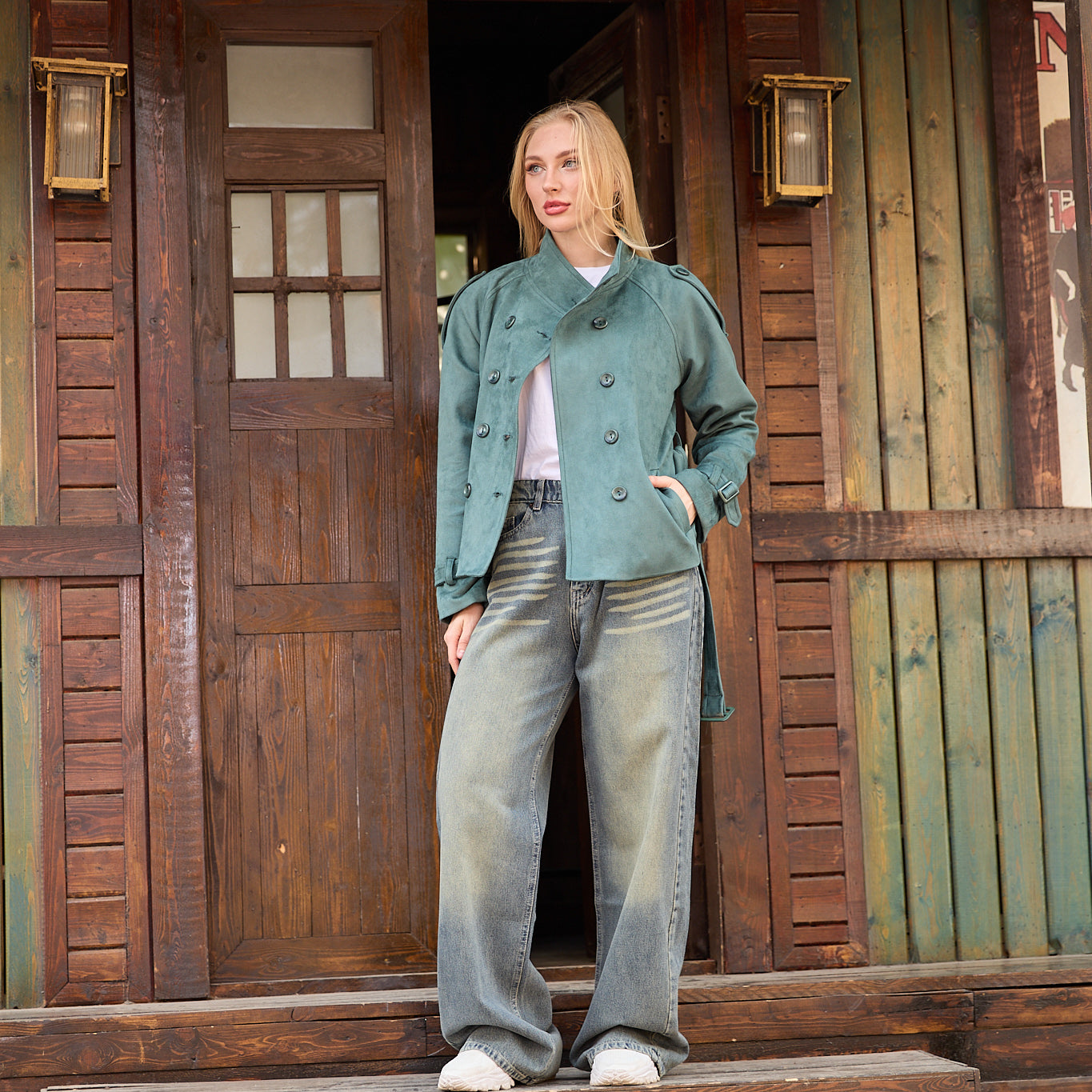 Own your power in this striking teal suede coat that commands presence from every angle. The dramatic high collar frames your features with bold sophistication, while the double-breasted front and cinched waist create an architectural silhouette that exudes control. Rendered in sumptuous suede-look fabric, this piece merges luxury with an unapologetic edge. Layer it over anything—minimalist slip dresses, statement separates, or rebellious leather—and watch how it elevates your entire presence. This is the coat for those who lead, not follow.
