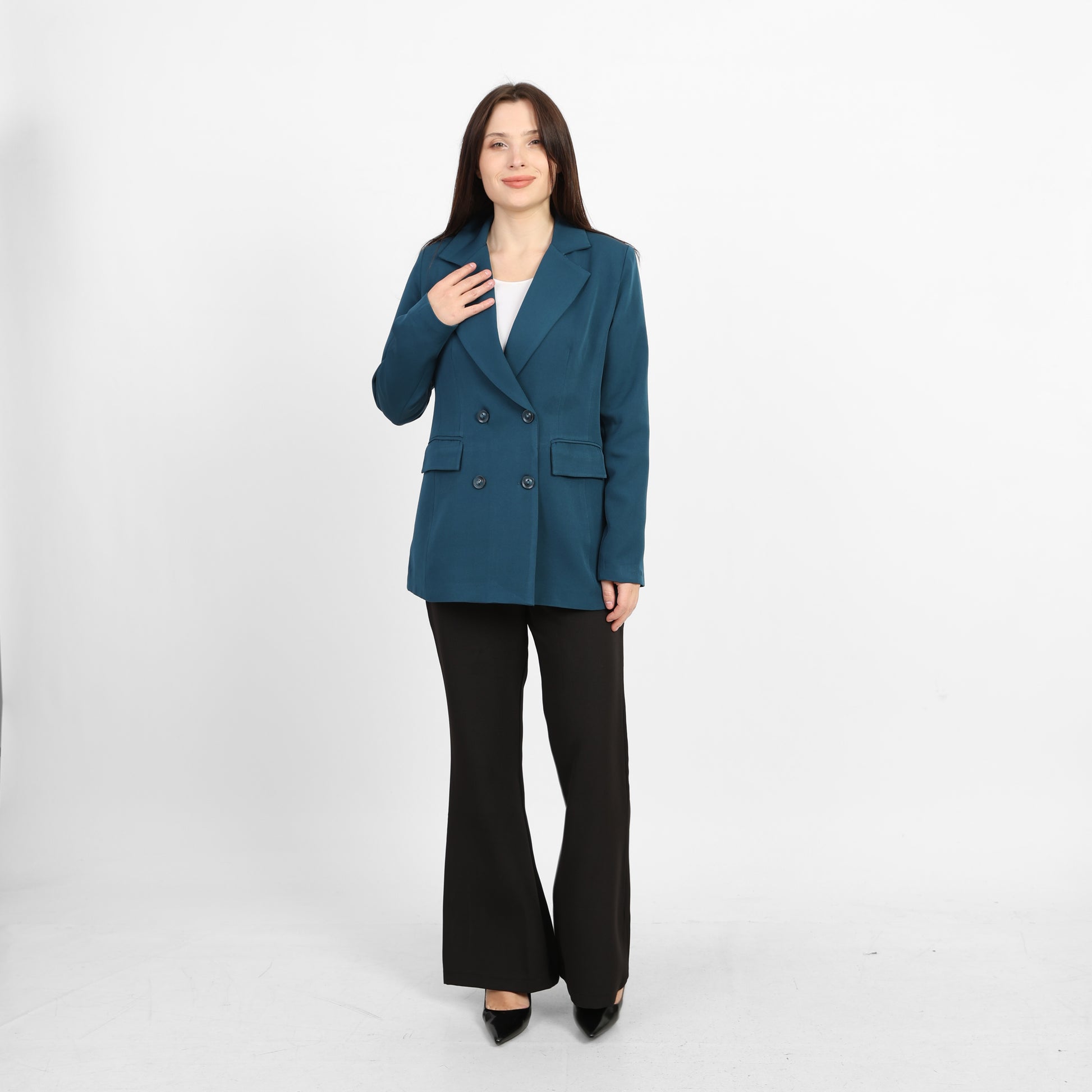 Make a statement with this teal double-breasted blazer, designed to command attention in any setting. The contrast buttons provide a refined finishing touch that elevates your professional and casual looks alike. Built with precision tailoring, this piece drapes beautifully and creates a confident silhouette. Whether you're closing deals or enjoying dinner out, this blazer is your go-to layer for understated luxury and timeless style.